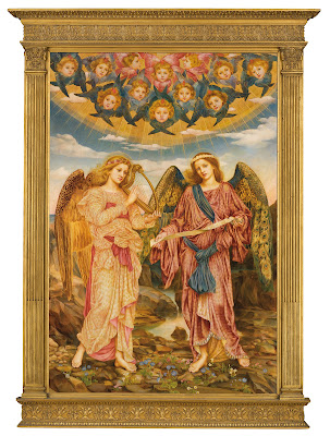It too is brilliantly drawn and coloured with elegant peacock wings and rippling drapery, but more robustly painted in oil and with an impressive pillared frame. The only drawback, in my view, are the juvenile Victorian faces of the seraphim, with windblown hair as if literally flying in heavenly air.